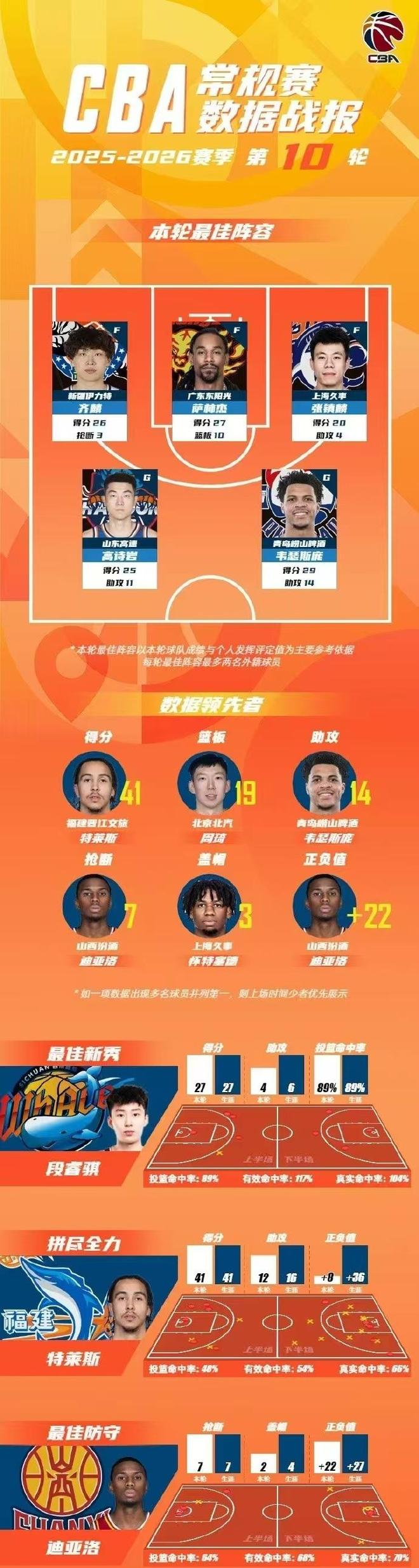 CBA官方公布常規(guī)賽第10輪最佳陣容,齊麟26分創(chuàng)賽季新高,率領(lǐng)新疆加時(shí)險(xiǎn)勝福建,張鎮(zhèn)麟20分加盟新高率領(lǐng)上海豪取6連勝升聯(lián)賽第三,高詩(shī)巖25+7+11賽季最強(qiáng)一戰(zhàn),薩林杰27+10+6和韋瑟斯
