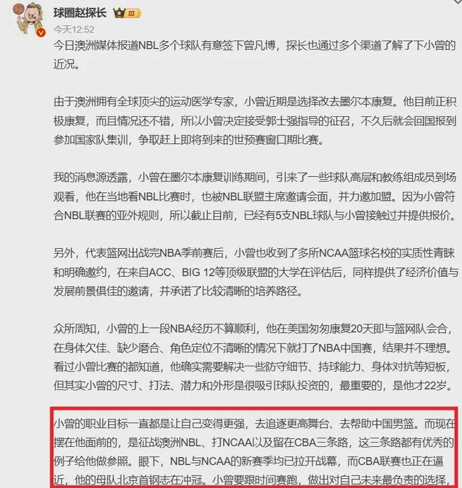 如果曾凡博仍有挑戰(zhàn)NBA的想法,那么NCAA是一個好出路,曝光度遠比NBL和CBA高;若是想歷練,NBL乃絕佳選擇,周琦就曾在澳洲打過球并得到極大的提升。