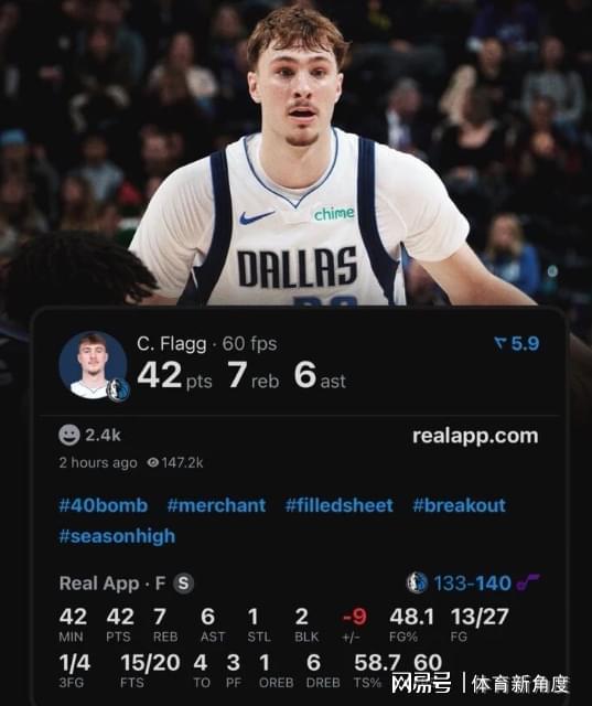 這場比賽最最最關鍵的是啥?這可是弗拉格的認證大作戰(zhàn)”?。〗裉爝@場打完,誰還敢說弗拉格這位狀元有“水掉”的可能?全場比賽,弗拉格那可是火力全開,打了41分鐘呢!27次出手,中了13個,罰球20次,進了15個,直接拿下42分7板6助。這42分,不僅刷新了他自己的個人生涯得分紀錄,還追平了獨行俠隊史新秀得分紀錄喲(想當年馬克 - 阿吉雷新秀時期在獨行俠也拿過42分呢)。嘿,就連東契奇和諾天王都沒達成過這個成就呢!這可是弗拉格生涯的第一個40+,這會不會像開了閘的洪水一樣,第一個來了,后面就“嘩啦啦”地無數(shù)個接踵而至啦?