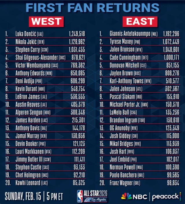 北京時(shí)間12月30日,NBA官方公布了2026年全明星首輪球迷投票結(jié)果,西部票王歸屬湖人球星盧卡·東契奇,東部則是揚(yáng)尼斯·阿德托昆博,其中,東契奇也是聯(lián)盟票王。西部目前球迷票數(shù)前五