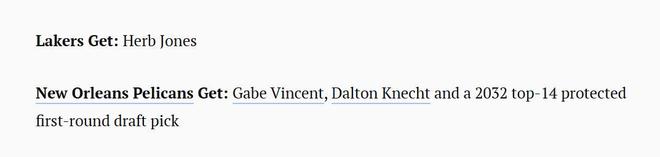 鵜鶘得到:文森特+克內(nèi)克特+湖人32年前14順位保護首輪簽。