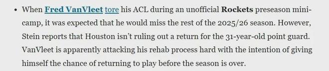 本賽季開賽前,范弗利特意外遭遇右膝前交叉韌帶撕裂,去年夏天以兩年5000萬美元續(xù)約火箭。