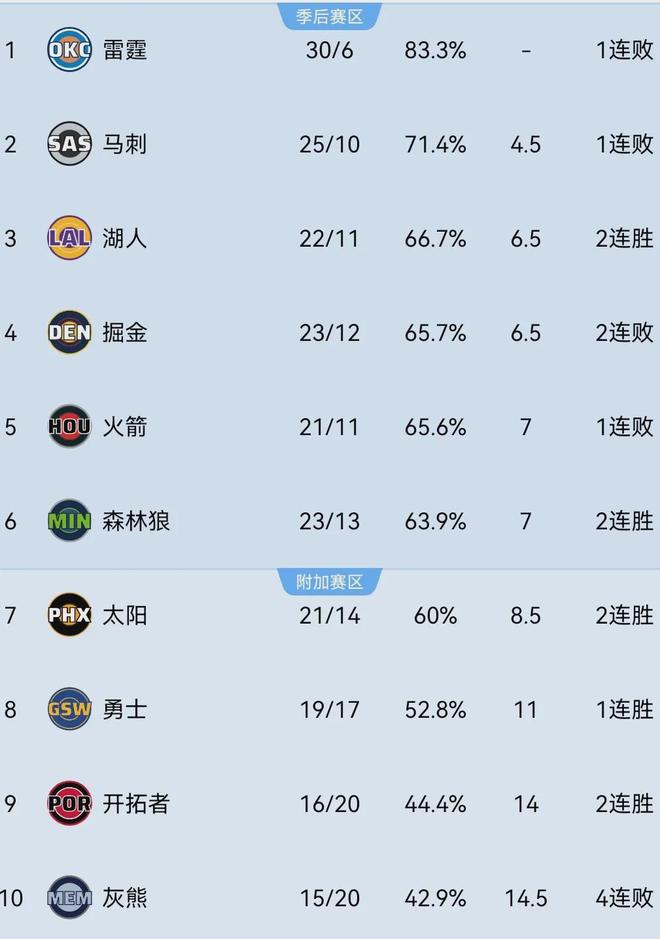 當(dāng)前西部前三甲分別是30勝6負(fù)的雷霆、25勝10負(fù)的馬刺,以及22勝11負(fù)的湖人,遭遇嚴(yán)重傷病潮的掘金則以23勝12負(fù)位列西部第四。