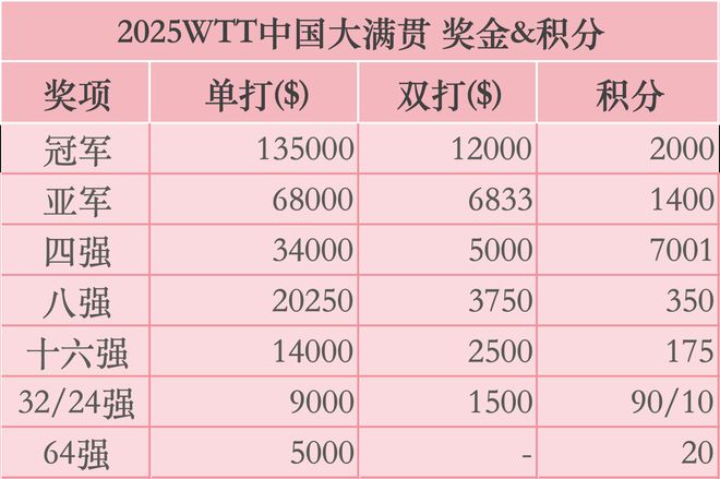從獎金結構來看,單打與雙打項目之間存在顯著差異,這是WTT賽事一直以來的慣例,也是球迷們討論的熱點之一:單打冠軍不僅可以獲得2000WTT世界積分的加成,更有13.5萬美元的獎金;相比之下,雙打項目雖也能獲得2000積分的加成,可獎金僅有1.2萬美元。