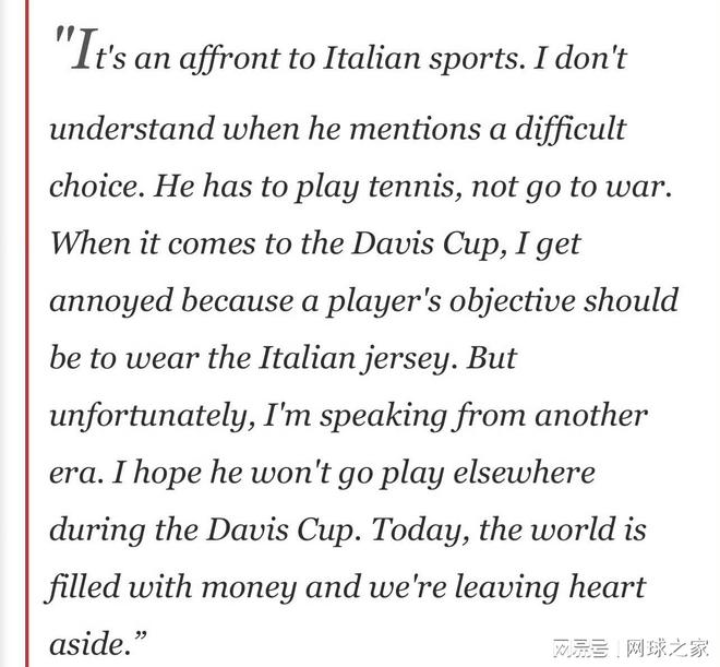 而另一位意大利網(wǎng)球名宿阿德里亞諾·帕諾塔試圖平和地看待這一爭(zhēng)議:“對(duì)我來(lái)說(shuō)和保羅、科拉多、安東尼奧,以及我們之前的皮耶特朗格利和其他所有人來(lái)說(shuō),甚至不會(huì)想到拒絕。”