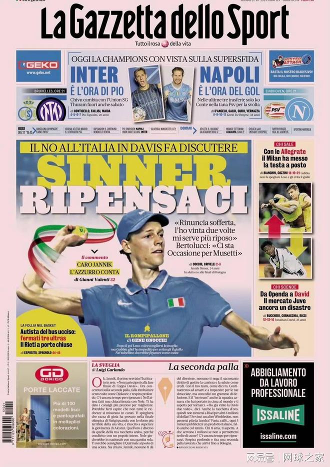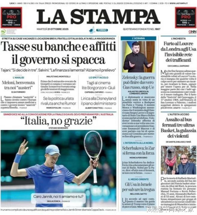 意大利網(wǎng)球名將辛納日前宣布,將不參加于11月18日至23日在博洛尼亞舉行的戴維斯杯決賽圈比賽,這一決定在意大利網(wǎng)壇引發(fā)巨大爭(zhēng)議。