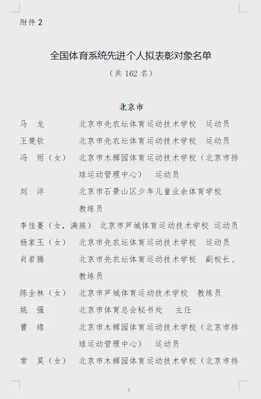 據(jù)國家體育總局人事司網(wǎng)站消息,昨天(10月27日),全國體育系統(tǒng)先進集體和先進個人評選表彰工作領(lǐng)導(dǎo)小組辦公室發(fā)布“關(guān)于全國體育系統(tǒng)先進集體和先進個人擬表彰對象的公示”: