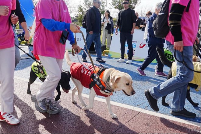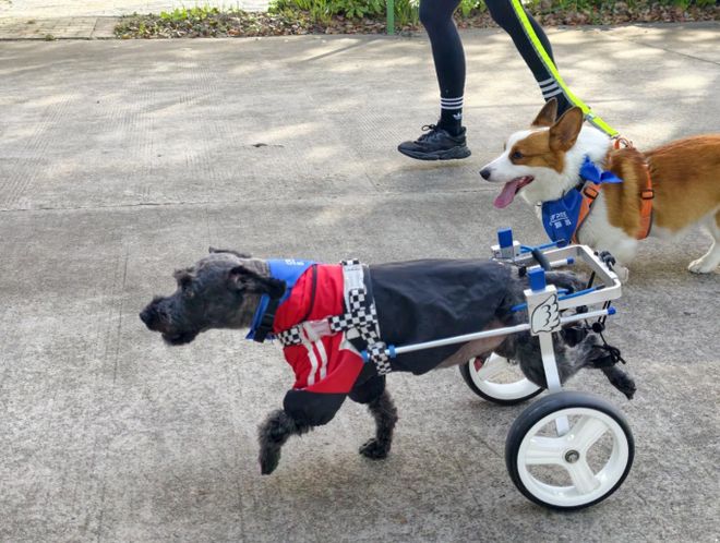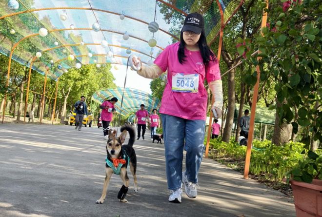 在人群中,有裝著小輪車的殘疾狗狗,也有正在康復(fù)訓(xùn)練中的導(dǎo)盲犬,還有被領(lǐng)養(yǎng)后第一次參加活動的流浪犬。