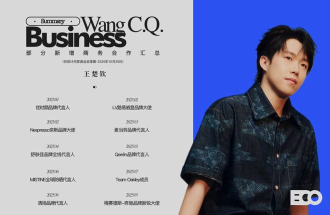 對(duì)應(yīng)地,樊振東、王楚欽等人的品類(lèi)合作也有精準(zhǔn)化傾向。其中,樊振東代言除大眾消費(fèi)品外,更多見(jiàn)于科技、汽車(chē)等突出體現(xiàn)「實(shí)力」「可靠」氣質(zhì)的品類(lèi);王楚欽則因其新生代、充滿(mǎn)活力的形象,成為L(zhǎng)V(LOUIS VUITTON)、Oakley等時(shí)尚、運(yùn)動(dòng)品牌的寵兒。