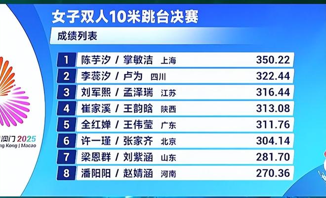 11月6日,2025粵港澳全運(yùn)會(huì)進(jìn)行了雙人女子10米臺(tái)跳水決賽,陳芋汐和掌敏潔聯(lián)手,奉獻(xiàn)了高質(zhì)量的五跳,以350.22分的高分奪冠。全紅嬋和王偉瑩組合311.76分獲得第五,張家齊與許一瑾組