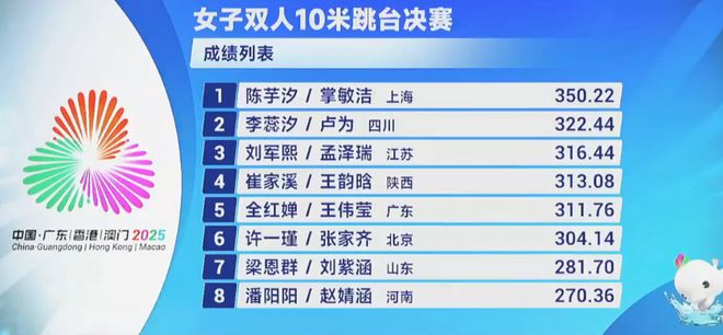 - 11月6日,2025全國(guó)運(yùn)動(dòng)會(huì)跳水女子雙人10米跳臺(tái)決賽,陳芋汐/掌敏潔五跳總分350.22奪得金牌。全紅嬋/王偉瑩311.7...發(fā)表于: 11-07 14:36