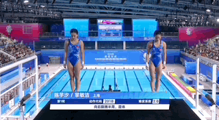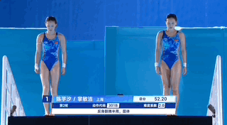 在上午的預(yù)賽中,陳芋汐和掌敏潔就以超第二名將近30分晉級(jí),決賽中兩人持續(xù)保持住了默契的配合,第一跳就以52.20的高分排名第一。