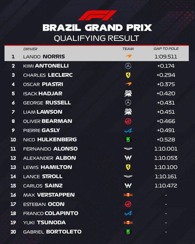 北京時(shí)間11月9日凌晨,2025賽季F1迎來(lái)巴西站排位賽的爭(zhēng)奪。最終,諾里斯依舊延續(xù)著自己本周末的出色狀態(tài)獲得桿位!安東內(nèi)利獲得第二,勒克萊爾獲得第三。皮亞斯特里表現(xiàn)平平獲得第