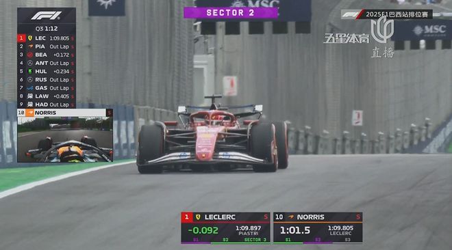 Q3的桿位爭(zhēng)奪一觸即發(fā),皮亞斯特里率先刷到第一,但此后勒克萊爾在第一計(jì)時(shí)段刷紫領(lǐng)先皮亞斯特里0.146秒,又在第二計(jì)時(shí)段領(lǐng)先0.001秒,以0.092秒的優(yōu)勢(shì)短暫刷到第一!