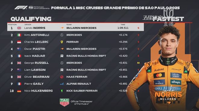 不過(guò),本周末狀態(tài)出色的諾里斯依舊無(wú)人能擋,以1:09.511的成績(jī)獲得桿位。隨后,小將安東內(nèi)利異軍突起!他在第二和第三計(jì)時(shí)段表現(xiàn)極為出色,雖然未能超越諾里斯,但依舊跑出1:09.685的成績(jī)刷掉勒克萊爾獲得第二!正賽將從第一排發(fā)車(chē)。