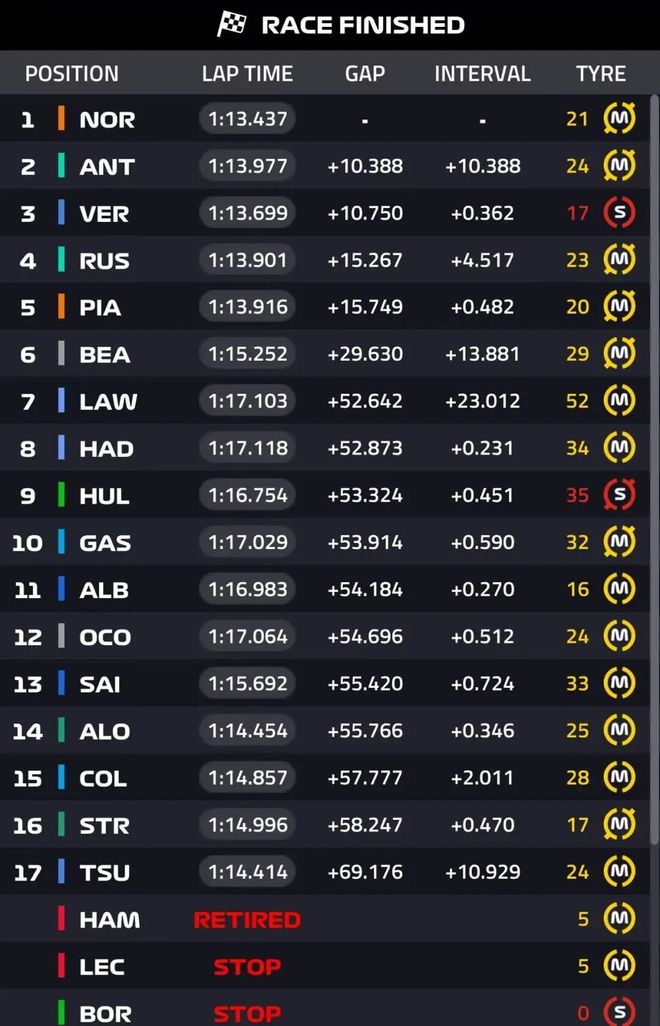 最后4圈,維斯塔潘進(jìn)入安東內(nèi)利的DRS區(qū),不過(guò)紅胎也到達(dá)極限,最終諾里斯第一完賽!安東內(nèi)利守住位置第二完賽,維斯塔潘盡管只拿到第三,但要知道他是從維修區(qū)起步,實(shí)屬不易,拉塞爾第四,皮亞斯特里第五。