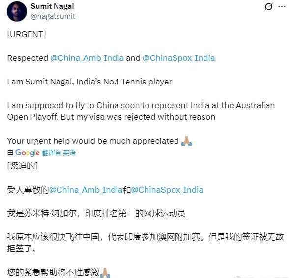 印度網(wǎng)球選手前往中國(guó)參賽遭拒簽,社媒求助中國(guó)駐印度大使館