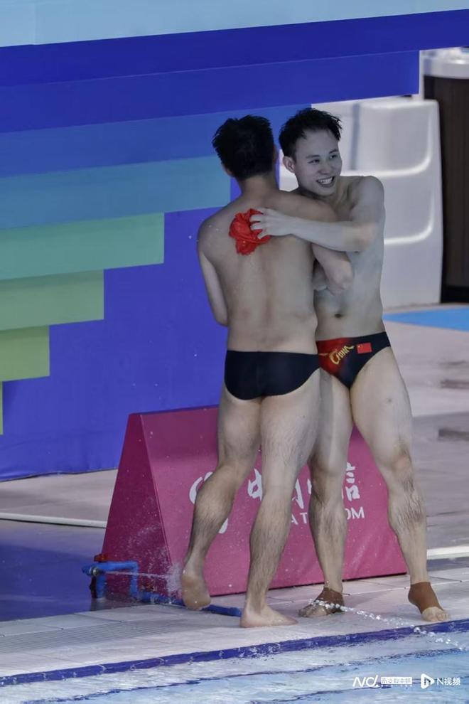 拿下男子雙人三米板冠軍后,謝思埸擁抱搭檔黃博文。