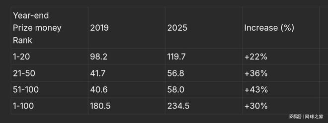 對(duì)排名較低的球員而言,情況則有所不同。排名21至50位的球員收入增長(zhǎng)了36%;排名51至100位的球員增長(zhǎng)了43%。這些群體的收入增幅跑贏了通脹,2025年的收入高于六年前。