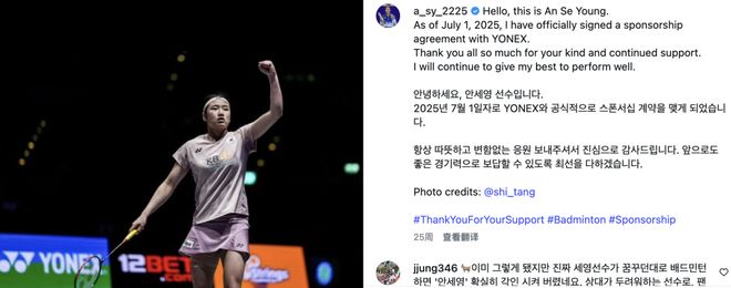 今年年初,韓國羽協(xié)正式開放運(yùn)動(dòng)員個(gè)人贊助權(quán)益,安洗瑩選擇與尤尼克斯簽約。據(jù)韓國媒體透露,這份合同總價(jià)值達(dá)100億韓元(約合人民幣5300萬元),合同期限為4年,刷新了全球羽毛球運(yùn)動(dòng)員的贊助紀(jì)錄。此外,韓國羽毛球運(yùn)動(dòng)員徐承宰、金元昊也與尤尼克斯簽訂了贊助合約,部分選手則簽約了威克多。