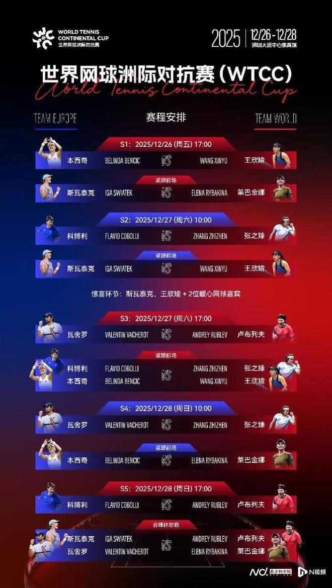 南都訊 記者汪雅云 12月26日,2025世界網(wǎng)球洲際對(duì)抗賽(WTCC)在深圳大運(yùn)中心體育館開(kāi)幕。兩位大滿貫冠軍斯瓦泰克、萊巴金娜領(lǐng)銜,中國(guó)網(wǎng)球明星王欣瑜、張之臻,以及盧布列夫、本西奇