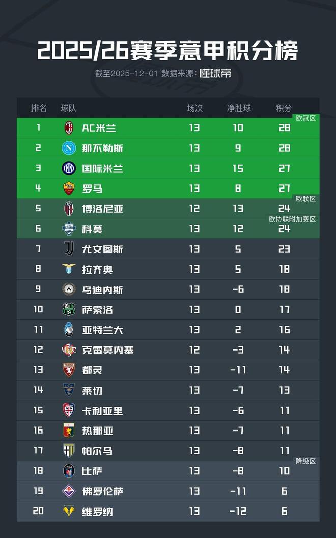北京時間12月1日,2025/26賽季意甲聯(lián)賽結束了第13輪的較量,積分榜的形勢依然十分膠著。米蘭和那不勒斯都在本輪擊敗了各自的對手并同積28分,前者憑借1個凈勝球的優(yōu)勢領跑積分榜,
