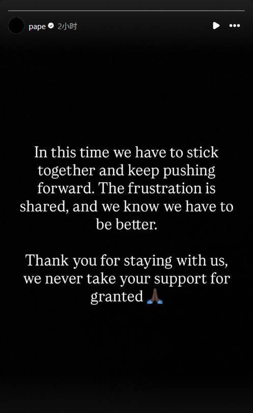 帕普-薩爾寫道:“在現(xiàn)在這個(gè)時(shí)候,我們需要團(tuán)結(jié)在一起,繼續(xù)推動(dòng)我們前進(jìn),我們都很沮喪,我們知道自己需要做得更好。感謝你們一直陪伴著我們,我們從來(lái)不認(rèn)為你們的支持是理所應(yīng)當(dāng)?shù)??!?/p>
